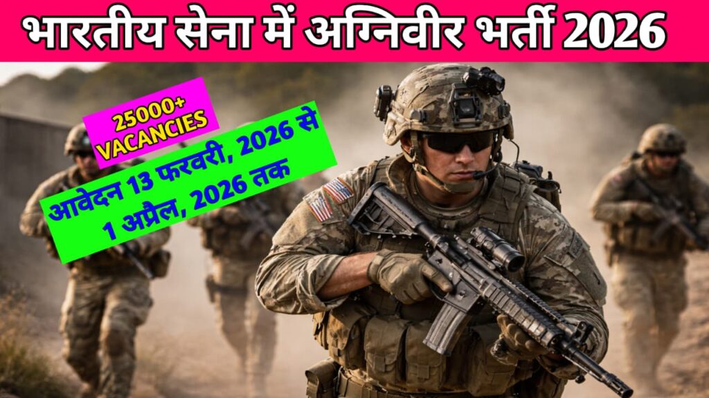 Agniveer recruitment भारतीय सेना भर्ती के महत्वपूण जानकारी 2026 भारतीय सेना में 25000+ से अधिक पदों के लिए घोषणा की है, जिसके लिए आवेदन 13 फ़रवरी 2026, से 1 अप्रैल 2026, तक खुली रहेंगी | इसे में जनरल ड्यूटी, टेकिन्कल, क्लर्क और ट्रेड्समेन है, उम्मीदवारों की आयु 17 से 21 वर्ष के लिए है,